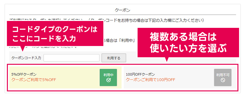 クーポンの種類により、割引内容などが異なります。最も条件の適したクーポンをお選びください。
