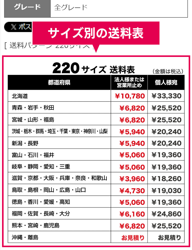 これにより、個人宅宛の送料が法人宛・営業所止めに比べて高くなっています。