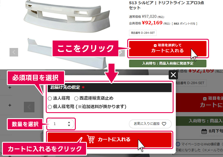 ・ほか、オプションなどの選択肢がある商品の場合は、そちらもお選びください。