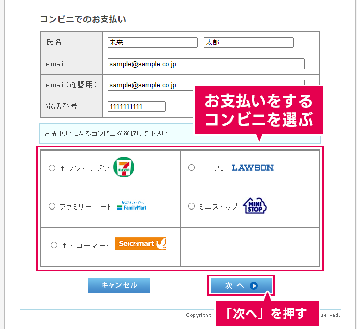 希望のコンビニエンスストアを選択し、「次へ」を押してください。