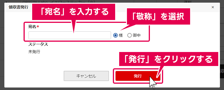 お宛名を入力し間違えてしまった場合なども、もう一度「領収書を発行する」ボタンを押していただき、改めて正しいお宛名を入力して再発行が可能です。