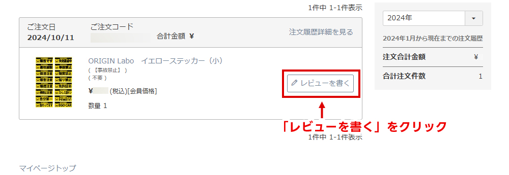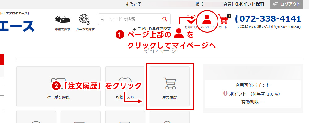 1.当サイトにログイン後、「マイページ」から「注文履歴」へとお進みください。