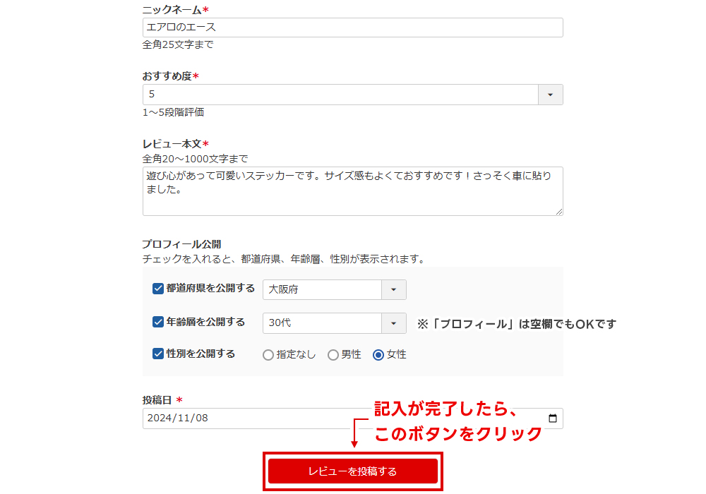 3.レビューに表示されるあなたの「ニックネーム」を入力し、商品の「おすすめ度」を1~5段階で選択してください。商品の評価や感想などを「レビュー本文」へご記入ください。